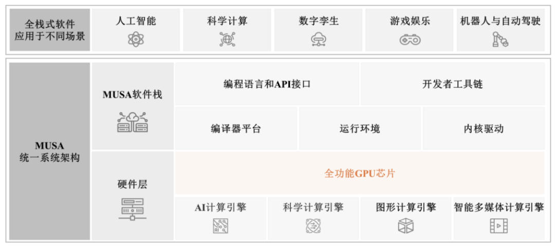 MUSA是一个融合了GPU硬件和软件的全功能GPU计算加速统一系统架构 ,涵盖了统一的芯片架构、指令集、编程模型、软件运行库和驱动程序框架。