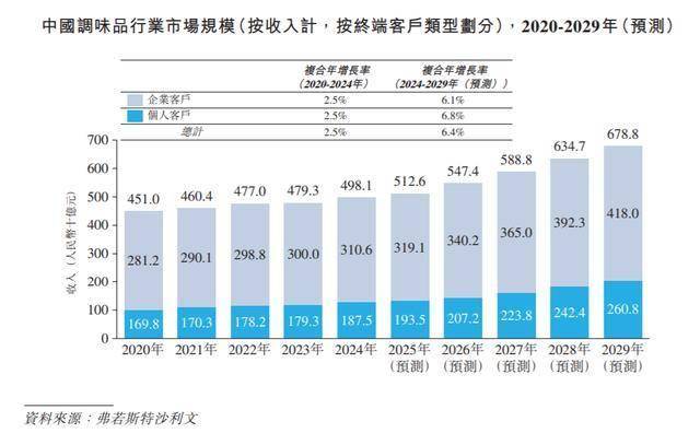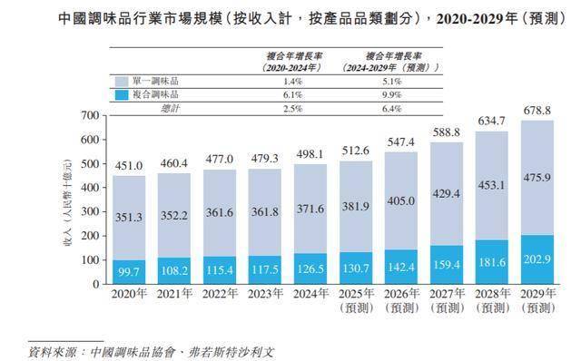 近年来,中国调味品市场保持稳步增长,按收入计,中国为全球第二大调味品市场。2024年,按收入计,中国调味品行业的市场规模达到人民币4,981亿元;受人均可支配收入增加、城镇化率提升、调味品品类多元化及销售渠道拓展等因素驱动,预计到2029年将扩大至人民币6,788亿元,自2024年至2029年的复合年增长率为6.4%。