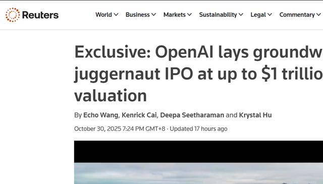 【环球网科技综合报道】10月31日,路透社报道称,据三位知情人士透露,人工智能领域的绝对领军者OpenAI已正式启动其首次公开募股的筹备工作,此次IPO对公司估值可能高达1万亿美元,有望成为全球有史以来规模最大的上市案例之一,标志着AI产业资本化进程迈入全新阶段。