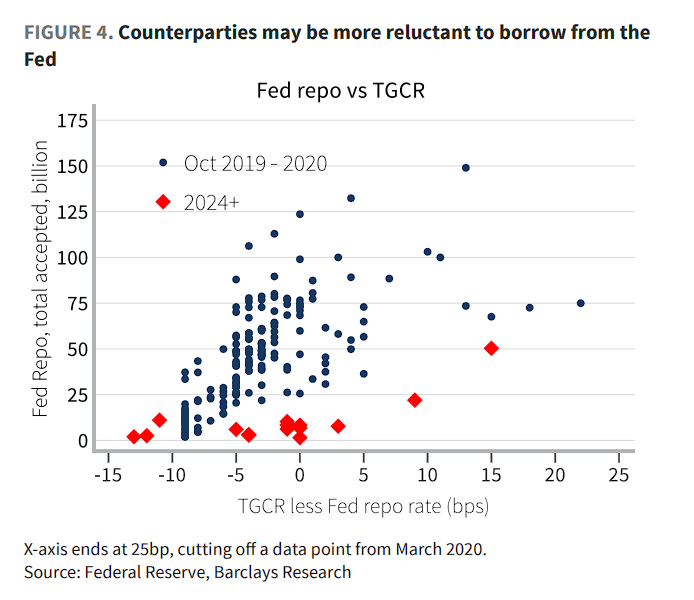 然而,在过去一周的几天里,代表货币市场基金借出利率的三方一般抵押回购利率(TGCR)已多次升至SRF利率之上。