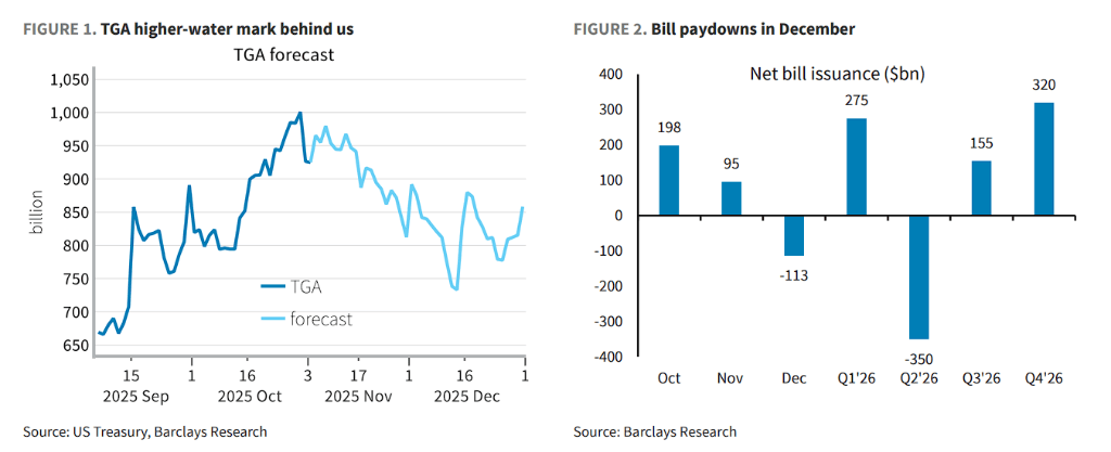 巴克莱预计,1万亿美元是TGA余额的“高水位线”。随着财政部计划在年底将现金余额降至8500亿美元,这意味着将有约1500亿美元的准备金从TGA账户回流到银行系统。