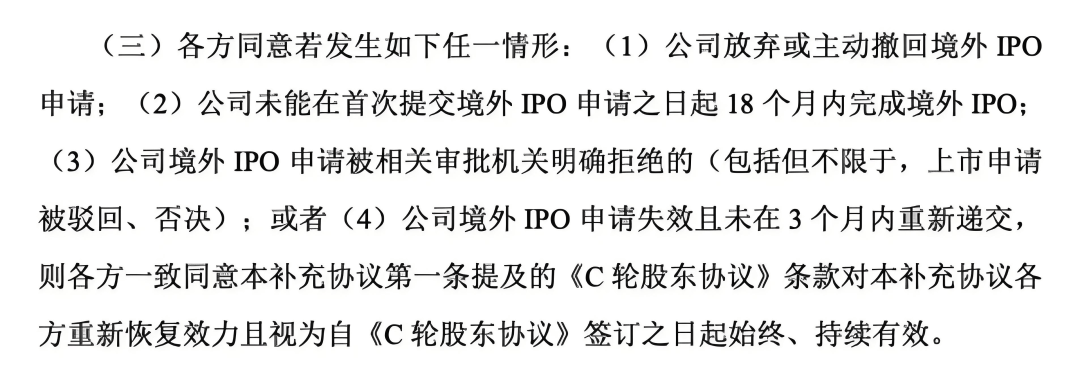 但条款并非“彻底终止”。补充协议第三条明确约定:若IPO失败,原《C轮股东协议》中的回购权条款将自动恢复效力。