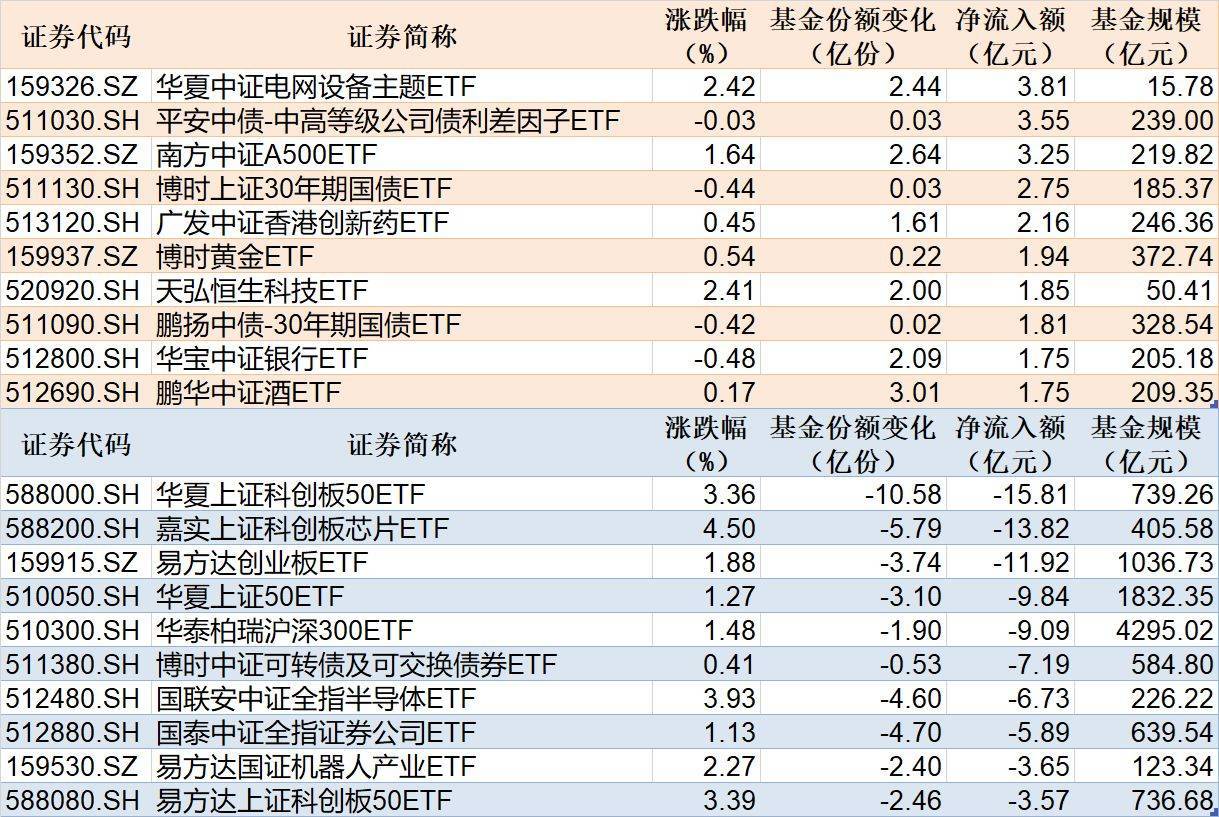 与此同时,华夏上证科创板50ETF基金份额减少10.58亿份,净流出额为15.81亿元;嘉实上证科创板芯片ETF基金份额减少5.79亿份,净流出额为13.82亿元;易方达创业板ETF基金份额减少3.74亿份,净流出额为11.92亿元。