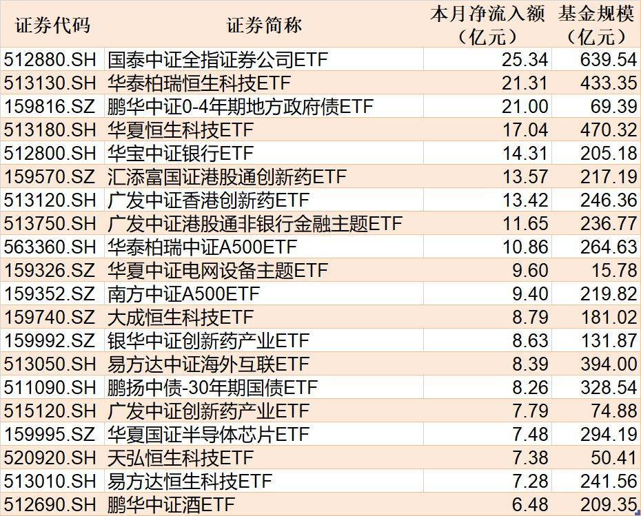 截至11月6日,本月资金净流入额居前20的ETF名单如下: