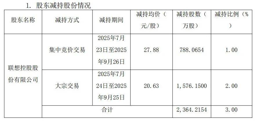 本次权益变动后,联想控股持股比例由26.54%下降至23.54%。以减持均价计算,联想控股套现超5.45亿元。