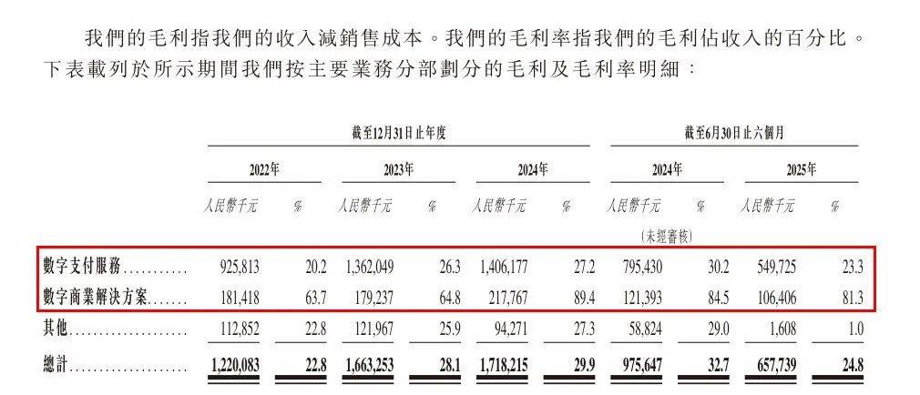 不过,数字支付服务的盈利能力却略显疲软。招股书显示,这一业务的毛利率偏低,2022年-2024年,数字支付服务毛利率为20.2%、26.3%、27.2%。