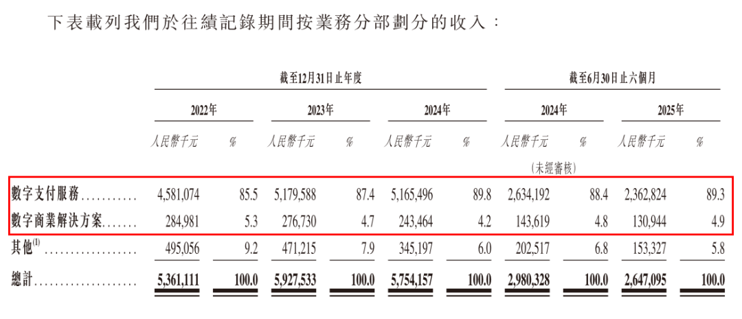 数字支付服务是其核心服业务,该业务主要为不同规模、不同行业的商户提供交易结算服务。招股书显示,2022年-2024年,数字支付服务营收分别为45.81亿元、51.80亿元、51.65亿元,占比分别为85.5%、87.4%、89.8%,近乎支撑起公司九成营收。