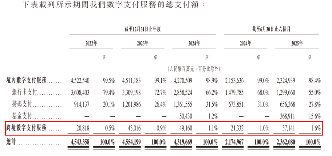 招股书显示,拉卡拉主营的数字支付服务中,跨境数字支付服务2022年至2024年占比分别为0.5%、0.9%、1.1%,2025年上半年提升至1.6%,虽然占比在逐渐提升,但相比境内支付服务,仍占比极少。