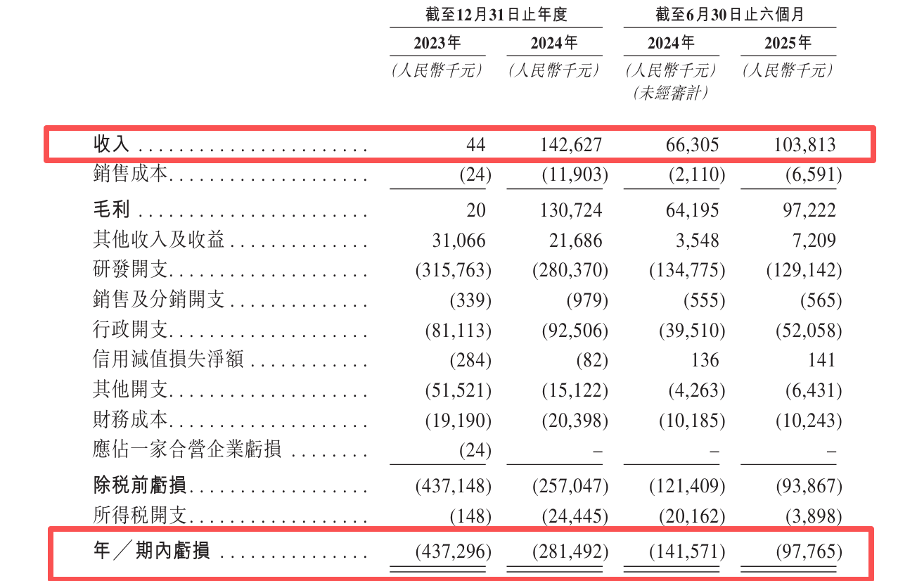值得一提的是,瑞博生物在过去两年半的时间里,累计亏损数额已突破8亿元。2023年和2024年及2025年上半年(下称“报告期”),公司的收入分别为4.4万元、1.43亿元、1.04亿元,期内净亏损分别为4.37亿元、2.81亿元、0.98亿元。