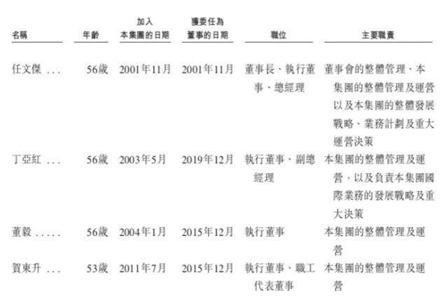 执行董事的平均年龄是55岁。56岁的任文杰任董事长、总经理,56岁的丁亚红任副总经理,另外两位执行董事分别为56岁的董毅及53岁的贺东升。其中,贺东升是执行董事中加入公司最晚的一位,其他三人入司都已超过20年。