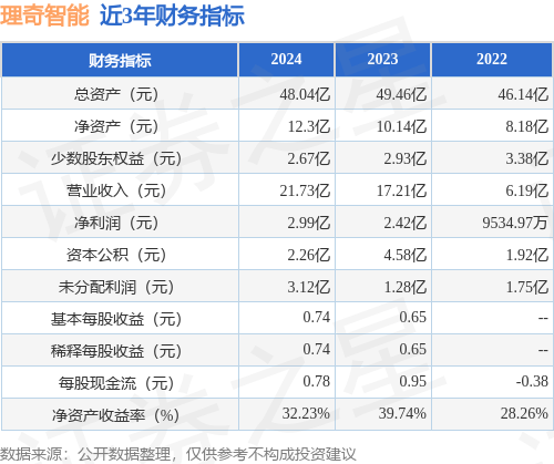 从目前公布的财报来看,理奇智能2024年总资产为48.04亿元,净资产为12.3亿元;近3年净利润分别为2.99亿元(2024年),2.42亿元(2023年),9534.97万元(2022年)。详情见下表: