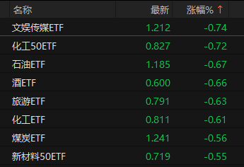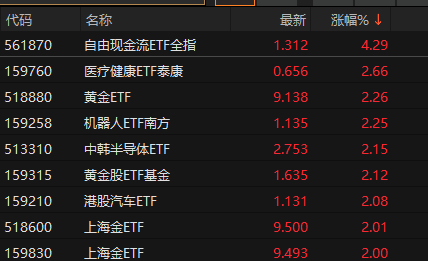 上证报中国证券网讯 11月11日,ETF开盘涨跌不一,自由现金流ETF全指(561870)领涨4.29%,医疗健康ETF泰康(159760)涨2.66%,黄金ETF(518880)涨2.26%。下跌方面,文娱传媒ETF(516190)领跌0.74%,化工50ETF(516120)跌0.72%,石油ETF(561360)跌0.67%。