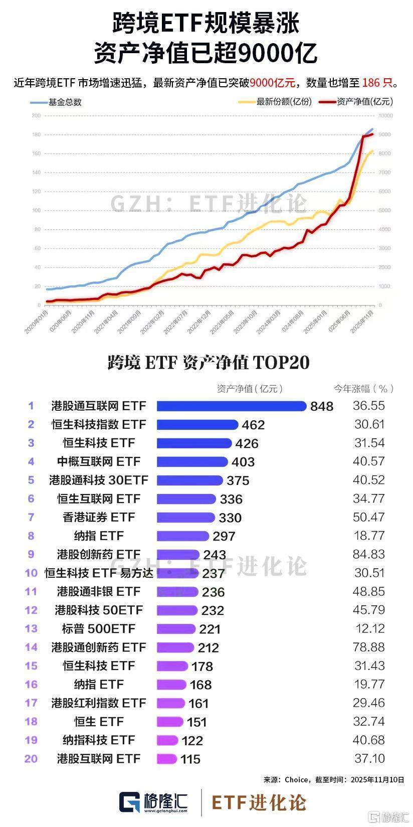 Choice数据显示,跨境ETF总规模已突破9000亿元整数大关,达9033亿元,而年初时总规模还只有4240亿元,年内增幅达113%,表明了投资者对跨境投资机会的广泛热情和高度关注。