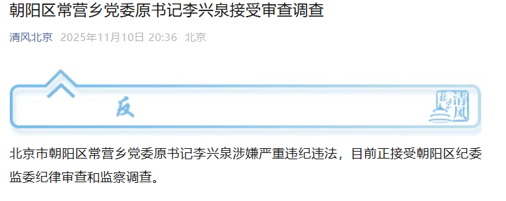 北京市朝阳区常营乡党委原书记李兴泉涉嫌严重违纪违法,目前正接受朝阳区纪委监委纪律审查和监察调查。