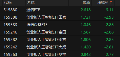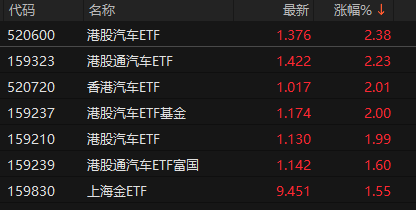 11月11日,ETF收盘涨跌不一,港股汽车ETF(520600)领涨2.38%,港股通汽车ETF(159323)涨2.23%,香港汽车ETF(520720)涨2.01%。下跌方面,通信ETF(515880)领跌3.11%,创业板人工智能ETF国泰(159388)跌2.93%,通信设备ETF(159583)跌2.88%。