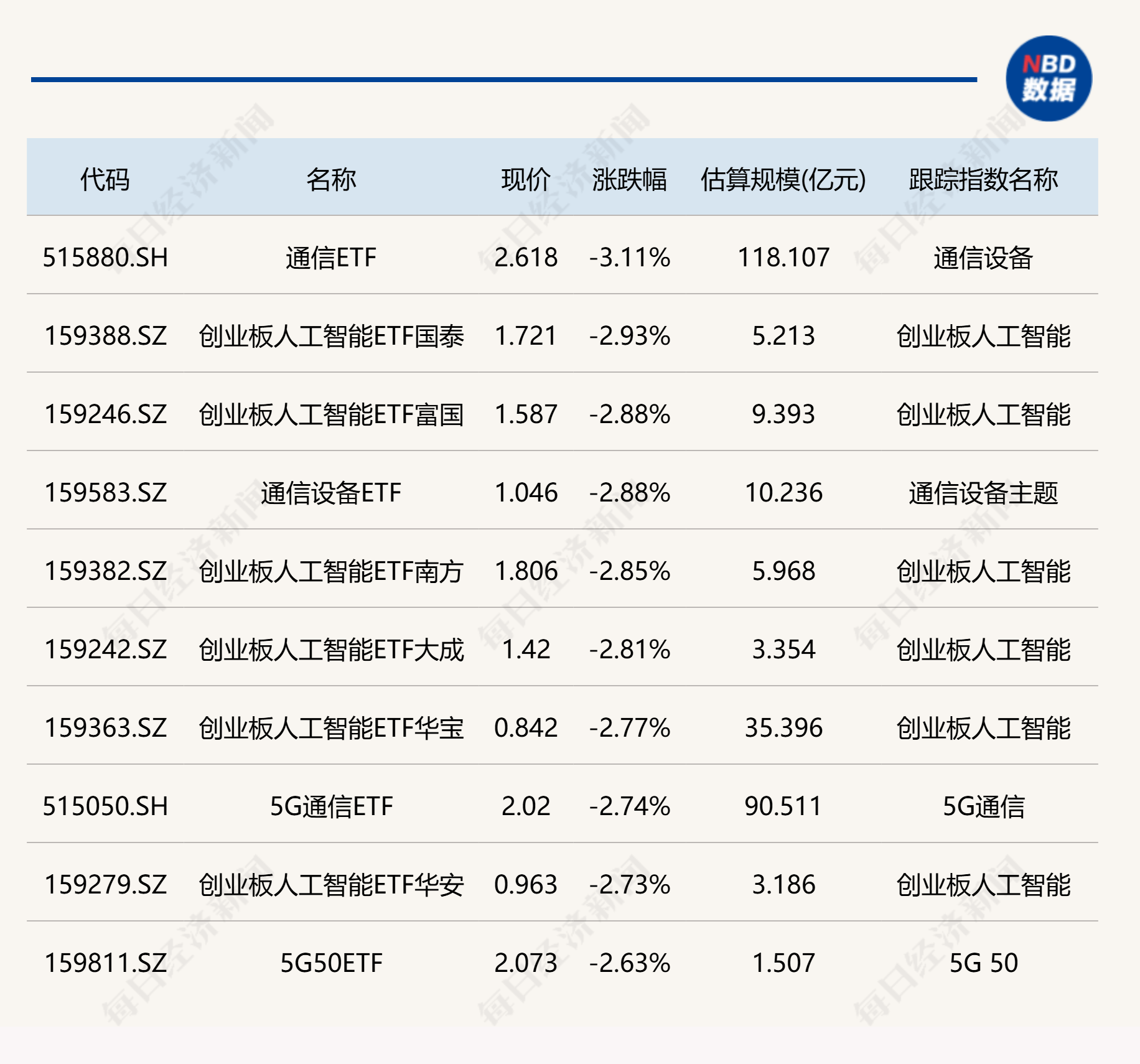 下跌方面,通信、创业板人工智能相关ETF跌约3%。
