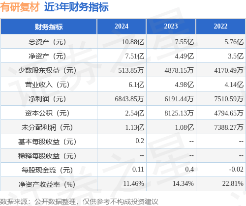 从目前公布的财报来看,有研复材2024年总资产为10.88亿元,净资产为7.51亿元;近3年净利润分别为6843.85万元(2024年),6191.44万元(2023年),7510.59万元(2022年)。详情见下表: