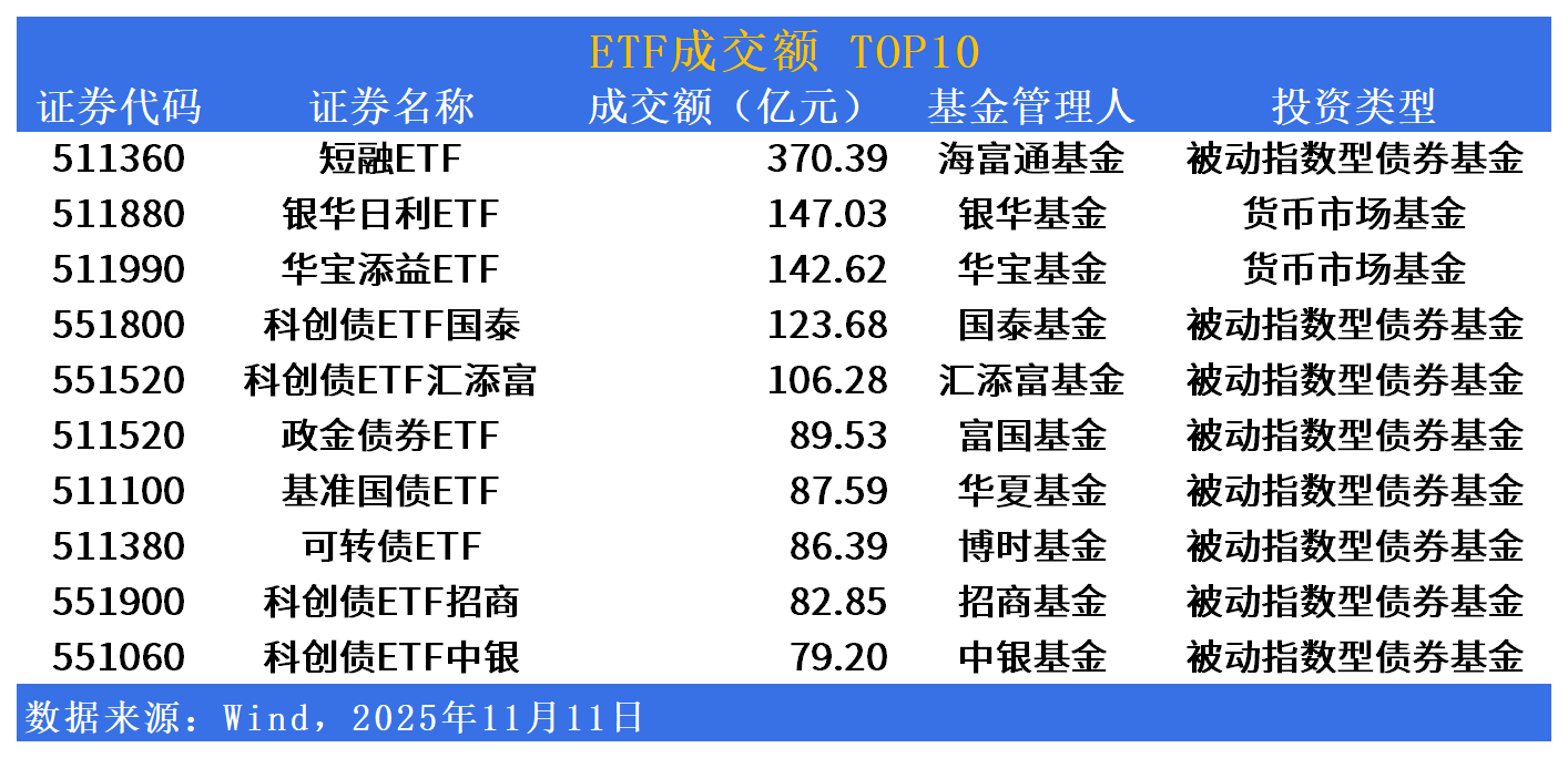 成交额方面,短融ETF(511360)今日成交额居首,达370亿元;银华日利ETF(511880)、华宝添益ETF(511990)、科创债ETF国泰(551800)成交额紧随其后。