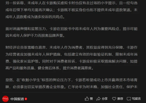 央视财经曾点名批评其诱导未成年人疯狂购卡,多部门也在开展涉盲盒经营专项治理,杜绝变相赌博行为。首次IPO时,证监会已要求卡游补充数据安全和儿童信息保护相关证明,合规性成为监管审查重点。