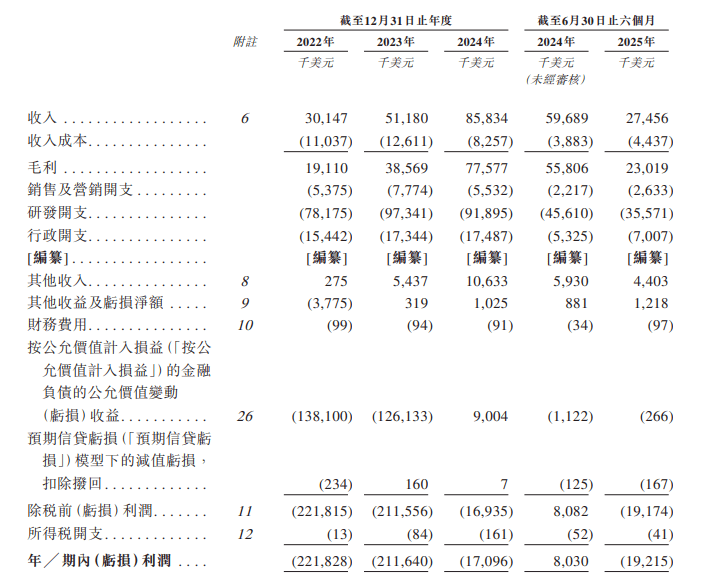 财务数据显示,2022、2023、2024年度和2025年上半年,英矽智能的营收分别约为3014.7万美元、5118.0万美元、8583.4万美元和2745.6万美元,净亏损分别为2.22亿美元、2.12亿美元、1709.6万美元和1921.5万美元。