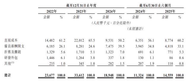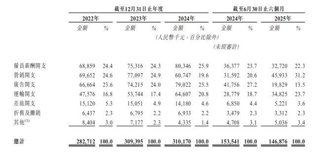 高流量的背后是高额的销售与经销开支。2022年至2025年上半年,溜溜果园的销售及经销开支分别高达2.83亿元、3.09亿元、3.10亿元和1.47亿元,持续超过同期净利润。其中,广告开支分别约为6666.4万元、7421.5万元、7902.2万元和1982.9万元。