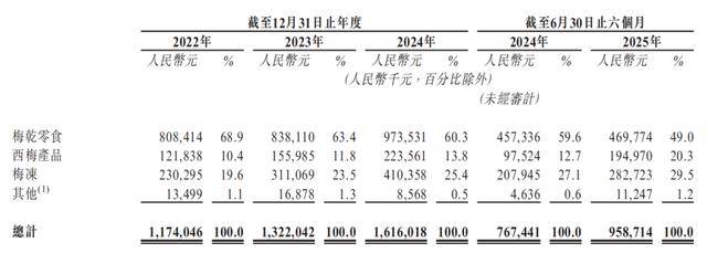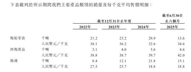 招股书显示,2022-2024年,公司两大主要产品售价明显下降:梅干零食从38.1元/千克降至32.6元/千克,梅冻则由27.5元/千克降至18.8元/千克。