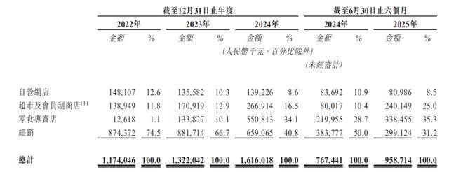 同时,溜溜果园的销售渠道发生了巨大转变。传统的经销渠道收入占比从2022年的74.5%骤降至2025年上半年的31.2%,而零食专卖店的收入占比则从1.1%飙升至35.3%。