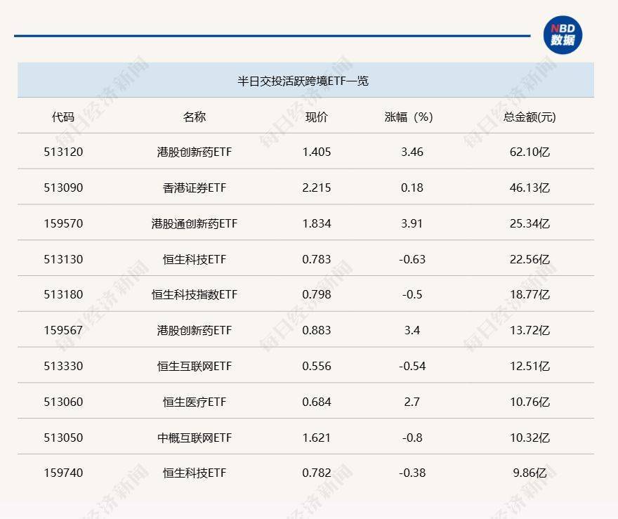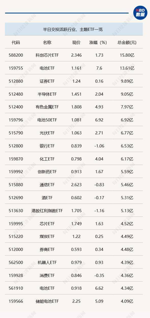 11月13日上午,电池相关ETF交易活跃,其中,电池ETF(159755)半日成交金额达到13.61亿元,电池50ETF(159796)半日成交金额也达到6.92亿元。跨境ETF方面,港股创新药ETF持续活跃,半日成交金额达到62.1亿元,香港证券ETF(513090)热度下降,半日成交金额不足50亿元。