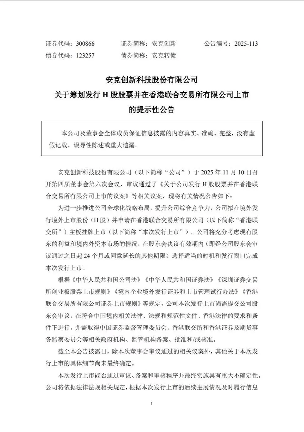 11月13日,安克创新昨日在深交所发布公告:公司拟在境外发行境外上市股份(H股)并申请在香港联合交易所有限公司主板挂牌上市。公司将充分考虑现有股东的利益和境内外资本市场的情况,在股东会决议有效期内(即经公司股东会审议通过之日起24个月或同意延长的其他期限)选择适当的时机和发行窗口完成本次发行上市。