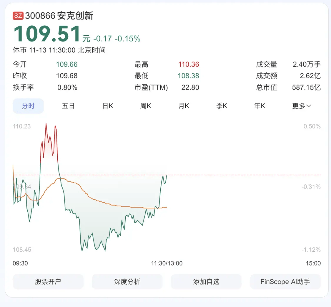 公告发出后,安克创新股价一度上涨至 110.36元/股,截至发稿,报109.51元/股,总市值为587.15亿元。