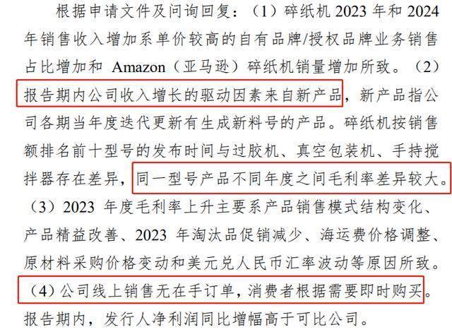 根据申请文件及问询回复,碎纸机2023年和2024年销售收入增加系单价较高的自有品牌/授权品牌业务销售占比增加和Amazon(亚马逊)碎纸机销量增加所致。