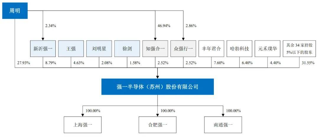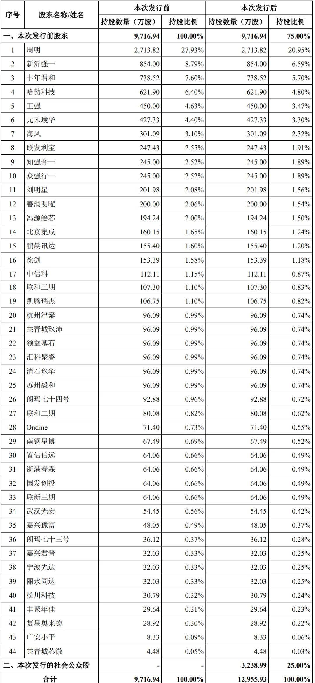 IPO后,周明持股为20.95%,新沂强一持股为6.59%,丰年君和持股为5.7%,华为旗下哈勃科技持股为4.8%,王强持股为3.47%,元禾璞华持股为3.3%,海风持股为2.32%,联发利宝持股为1.91%,知强合一、众强行一分别持股为1.89%,刘明星持股为1.56%;