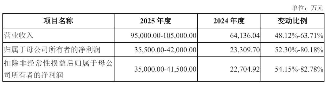 2025年度,公司预计可实现营收约 9.5亿至10.5亿,同比增幅约为48%至63.71%;公司预计可实现扣非净利润同比增幅约为52.30%-80.18%和 54.15%-82.78%,主要变动原因与2025 年1-9月相关变动原因一致。