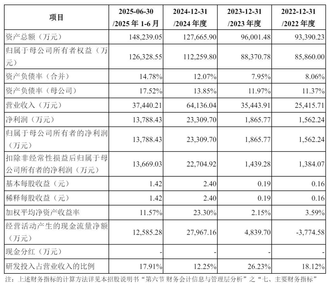 招股书显示,强一股份2022年、2023年、2024年营收分别为2.54亿元、3.54亿元、6.41亿元;净利分别为1562万元、1865.77万元、2.33亿元;扣非后净利分别为1384万元、1439万元、2.27亿元。