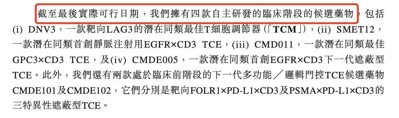 截至最后实际可行日期,时迈药业拥有四款自主研发的临床阶段的候选药物,包括DNV3,一款靶向LAG3的潜在同类最佳T细胞调节器(TCM);SMET12,一款潜在同类首创静脉注射用EGFR×CD3 TCE; CMD011,一款潜在同类最佳 GPC3×CD3 TCE;及CMDE005,一款潜在同类首创EGFR×CD3下一代遮蔽型TCE。