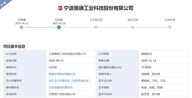 此次冲击上市,惠康科技拟募集资金约17.97亿元。据悉,惠康科技主板IPO于2025年6月12日获得受理,并于当年6月26日进入问询阶段。