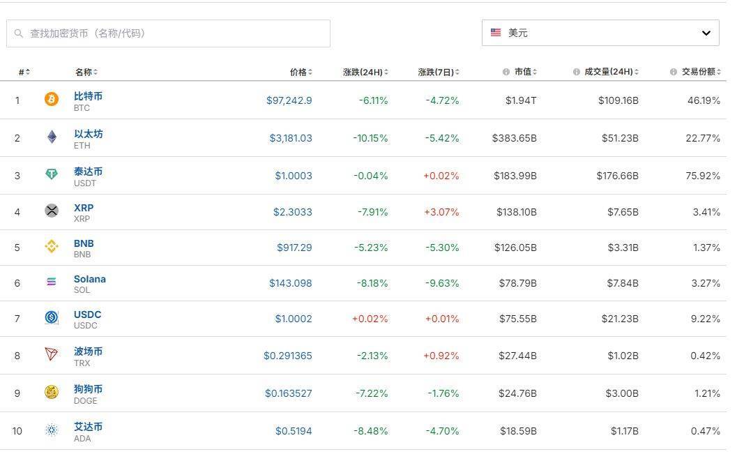 截至发稿,比特币报97242.9美元,跌幅6.11%。以太坊同样走低,跌幅超10%。此外,狗狗币、艾达币等均有不同程度跌幅。
