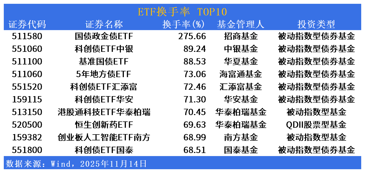 换手率方面,国债政金债ETF(511580)换手率居首,达275%;科创债ETF中银(551060)、基准国债ETF(511100)、5年地方债ETF(511060)换手率居前。