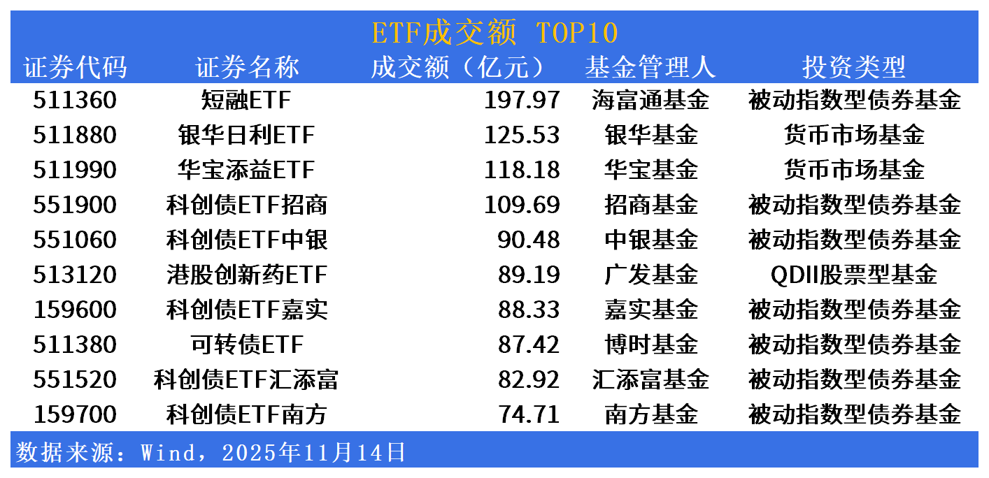 成交额方面,短融ETF(511360)今日成交额居首,达197亿元;银华日利ETF(511880)、华宝添益ETF(511990)、科创债ETF招商(551900)成交额紧随其后。