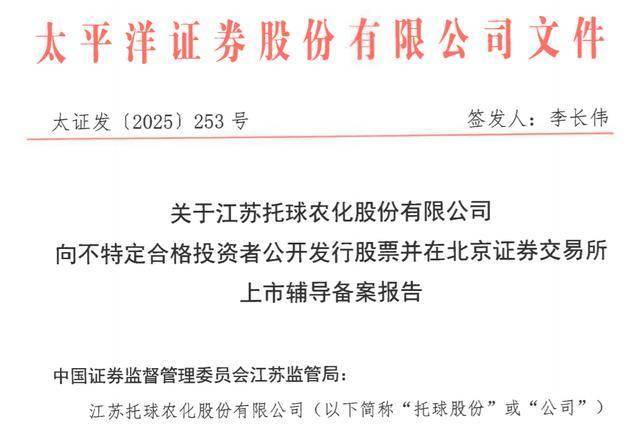 瑞财经 王敏 11月13日,江苏托球农化股份有限公司(以下简称“托球股份”)在江苏证监局启动IPO辅导,拟北交所上市,辅导机构为太平洋证券。