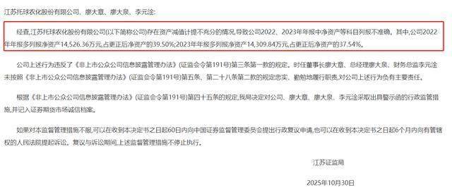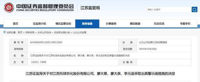 值得注意的是,在10月30日,江苏证监局发布关于对托球股份、廖大章、廖大泉、李元淦采取出具警示函措施的决定。