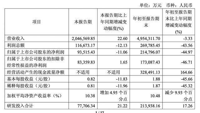 2025年前三季度,公司实现营收为495.43亿元,同比减少3.33%;归母净利润为21.48亿元,同比减少44.97%。