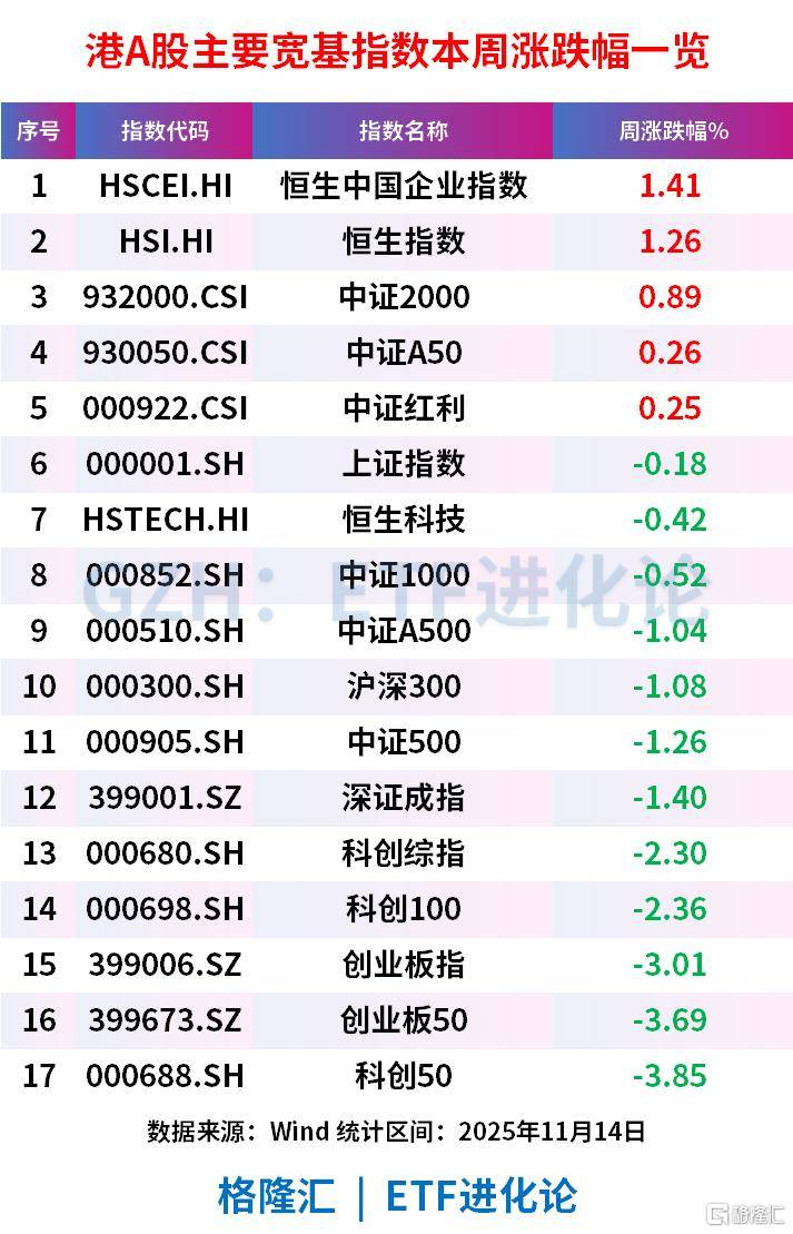 全周表现来看,恒生中国企业指数、恒生全周分别涨1.4%和1.26%。上证指数本周微跌0.18%,沪深300和中证A500分别跌1.08%和1.04%,成长含量较高的科创板50、创业板指领跌,全周分别跌3.8%、3%。
