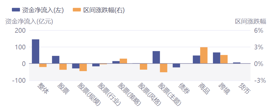 本期(2025年11月10日-11月13日),尽管大盘震荡,但行业主题ETF依旧成为吸金主力。当前市场呈现“结构分化、轮动加快”的特点,热点切换频繁,短期波动可能加剧,避险资产仍成为资金当下主流方向。从数据上看,本期资金净小幅流入145.37亿元。其中,跨境型ETF,商品型ETF,股票型ETF净流入居前,股票型ETF本期净流入46.20亿元,