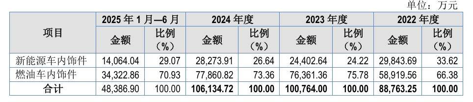 据通领科技招股书(上会稿),报告期各期,燃油车内饰件产品占该公司主营业务收入的比例分别为66.38%、75.78%、73.36%、70.93%。相比之下,新能源车内饰件产品收入占比较低。