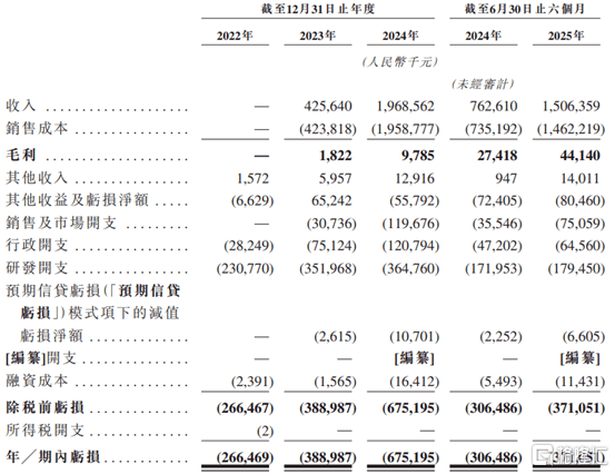 2023年、2024年及2025年上半年,深向科技分别交付509辆、3002辆及2873辆汽车,对应产生收入约4.26亿元、19.69亿元、15.06亿元。