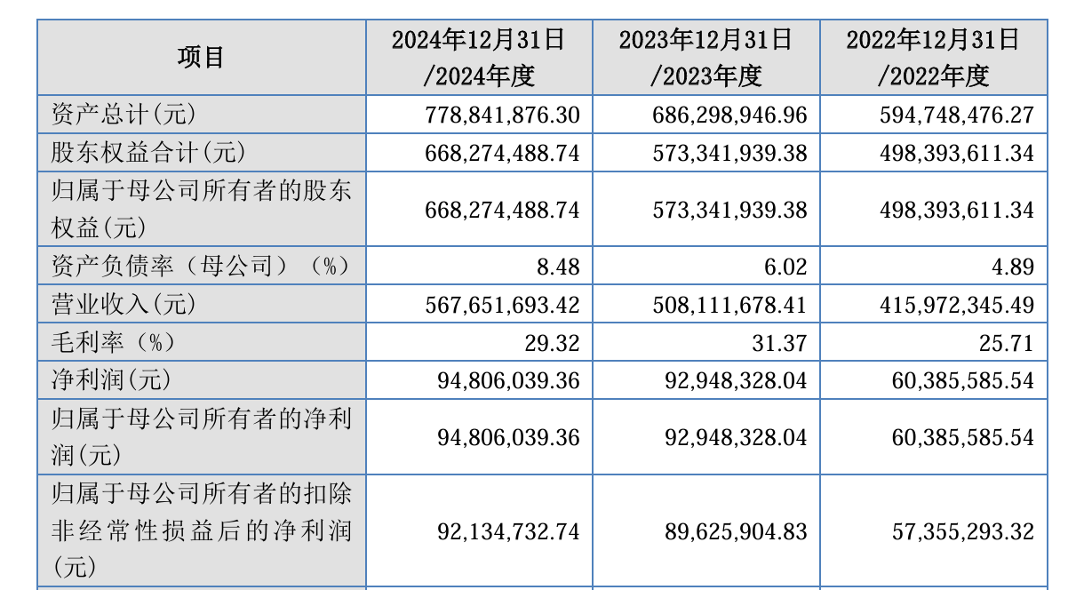 业绩方面,2022年至2024年(下称“报告期”),永励精密实现营业收入分别为4.16亿元、5.08亿元和5.68亿元,归母净利润分别为6038.56万元、9294.83万元和9480.60万元。