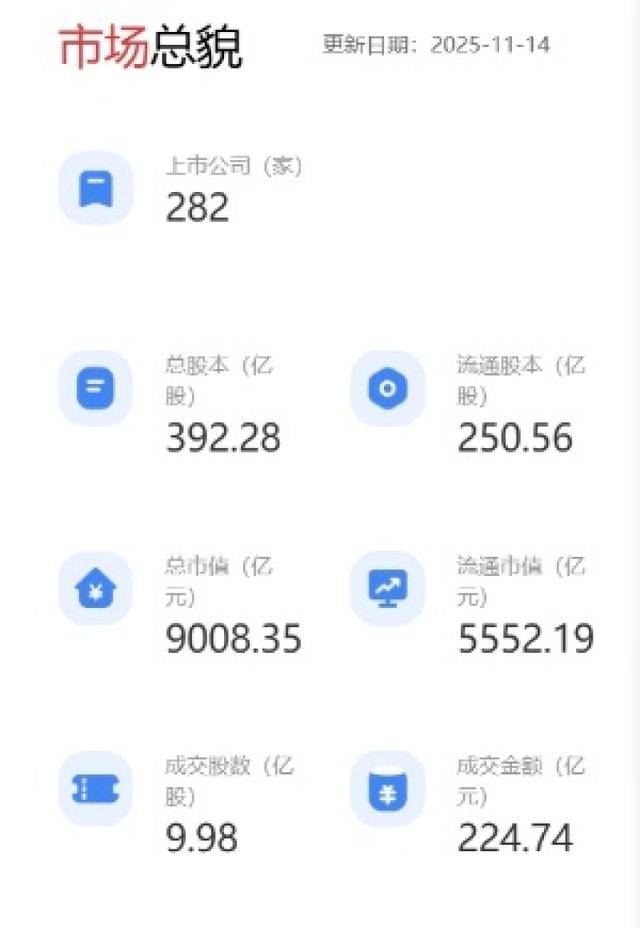截至11月14日,北交所现有上市公司282家,总市值为9008.35亿元,中小企业占比超八成,民营企业占比近九成,国家级专精特新“小巨人”企业超一半。市场合格投资者总数超950万户。