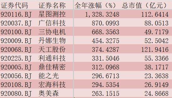 其中,星图测控(920116.BJ)股价涨幅高达13.2倍,位居第一,广信科技(920037.BJ)涨幅为870%,位居第二,三协电机(920100.BJ)涨幅为668%,位居第三。