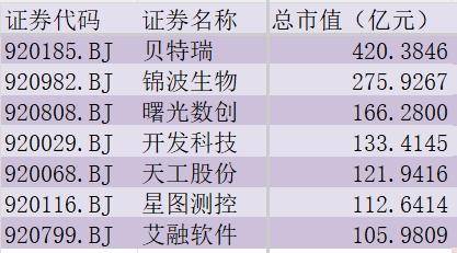 据同花顺iFinD统计显示,市值过百亿公司有7家,分别为贝特瑞(920185.BJ)、锦波生物(920982.BJ)、曙光数创(920808.BJ)、开发科技(920029.BJ)、天工股份(920068.BJ)、星图测控(920116.BJ)、艾融软件(920799.BJ)。